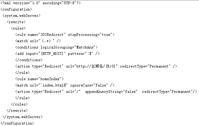 然后就是基于windows平臺下的301重新定向。因為windows平臺下的IIS和Linux的平臺存在著一定的差別,對此需要和IDC供應(yīng)商進行商討,了解基于windows平臺下的IIS配置。在windows平臺下,可以在根目錄下創(chuàng)建一個web.config文件,然后在這個文件中輸入下面的代碼,具體如下圖所示。