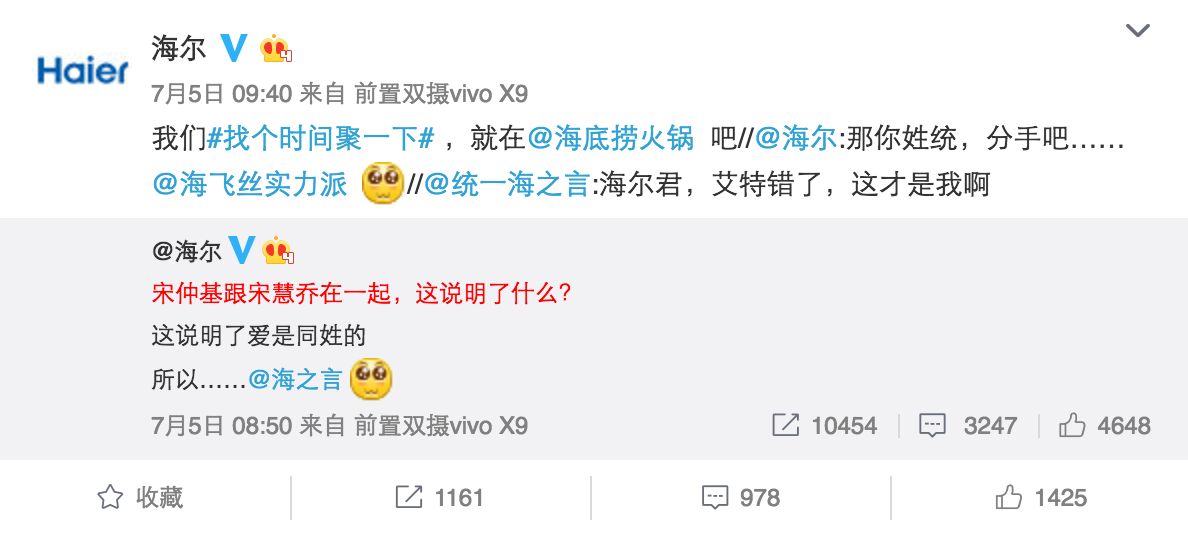 海爾搶熱門的能力在前幾天宋仲基宋慧喬公布戀情時,再次得到了印證。海爾迅速get到了宋仲基和宋慧喬同姓的點(diǎn),發(fā)微博@和自己同姓的品牌強(qiáng)行組CP,同姓組CP這個點(diǎn)也很容易被模仿,藍(lán)V參與度也異常高漲,比如"海信@海天醬油"、白貓凈界@白敬亭"等等。